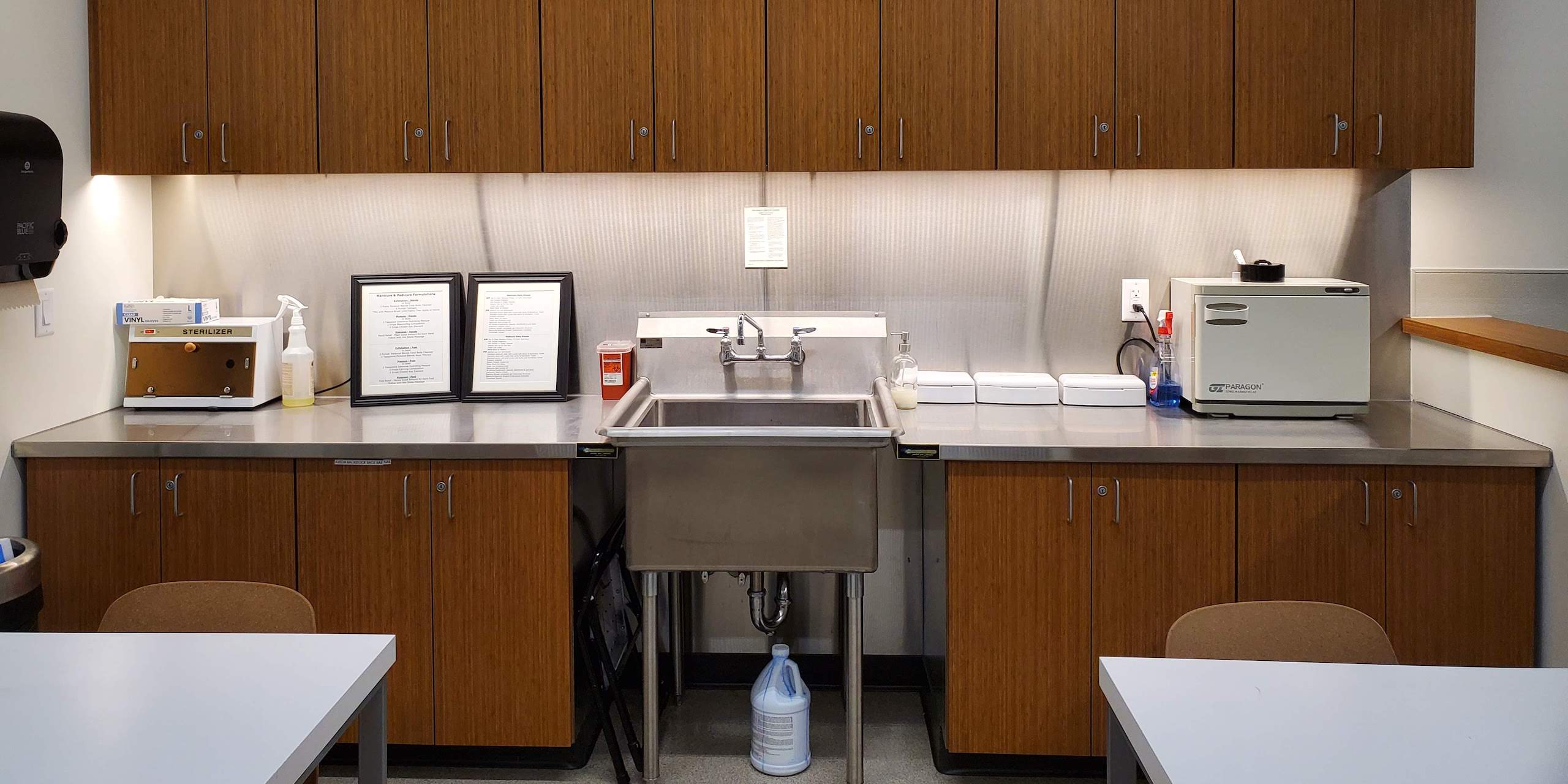The stainless steel counters were fabricated out of 16ga 304 #4 stainless steel and the wall panels were 20ga stainless steel with cut outs for outlets. The counters had standard turn down edges, and maple plywood sub bases. The one large counter top had a bolted field joint in order to get the countertop into the building. The stainless steel countertops were a perfect solution for the salon, as they are durable and easy to clean.